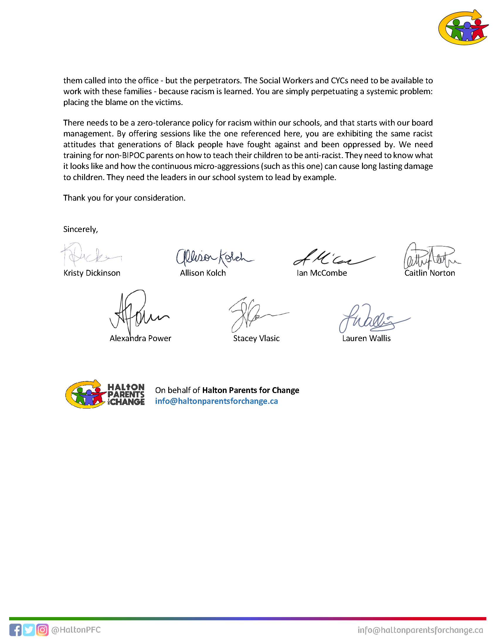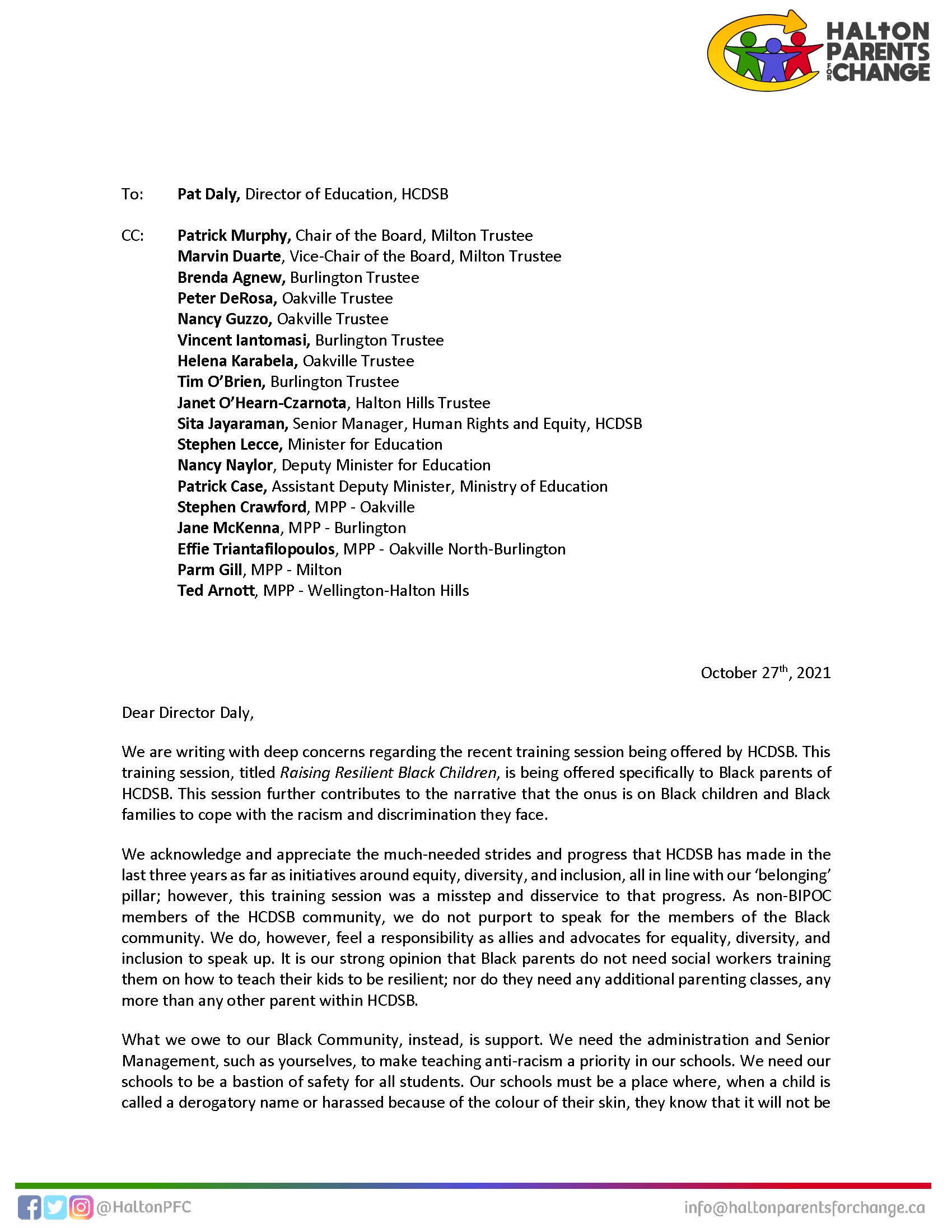 Halton Parents for Change also submitted a letter of correspondence regarding the workshop for the November 2nd Regular Board Meeting, below (click to enlarge).